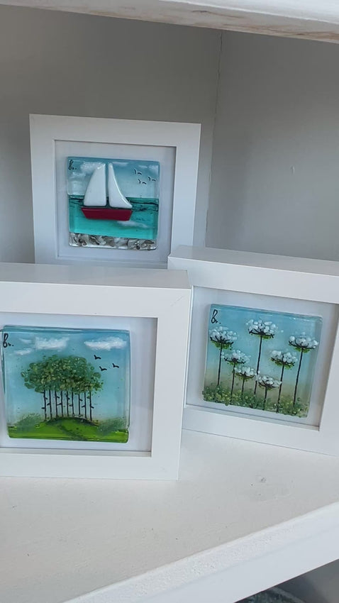 The glass panel sits on top of a deep box frame, creating a subtle sense of depth. It can be displayed freestanding on a shelf or mantelpiece, or hung on the wall.